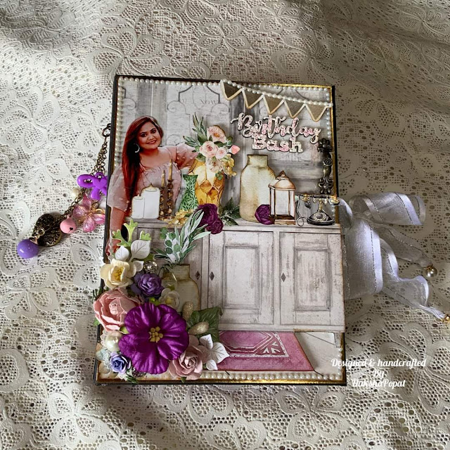 As she wanted a photo frame in her mini album...so that later she can display on a table ...so I have given nice shadow box frame on right side when you open the album and on left side all flips and folds pages to fit photos...